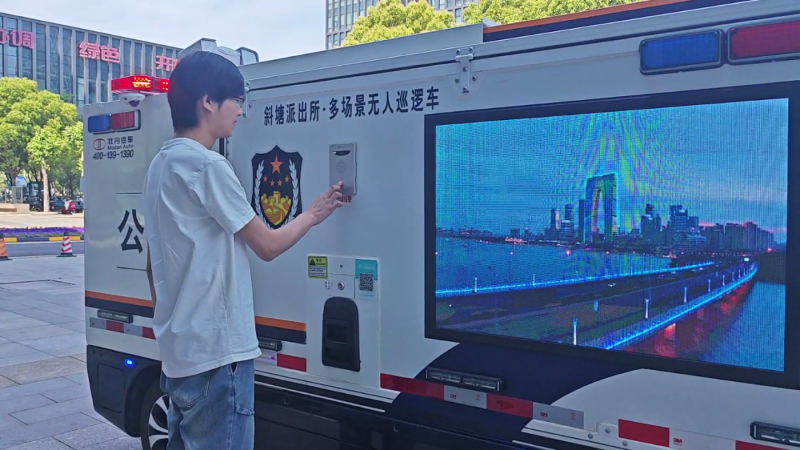 不久前,王先生發現自己的手機丟失了,看到附近的多場景無人巡邏車,隨即上前嘗試點擊車身上醒目的紅色“一鍵報警”按鈕。智慧警務指揮平臺立即接收到報警信息,精準定位到事發地點,并同步將現場畫面傳輸至指揮室。及時了解情況后,民警第一時間開展工作,很快幫助王先生將丟失的手機找回。
