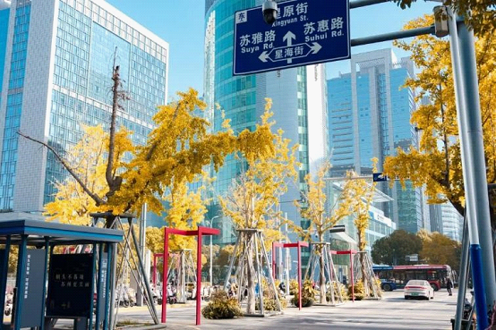 Along the Suzhou Avenue, flanked by modern skyscrapers, the golden hues of ginkgos add the brightest seasonal tones to this urban canvas.