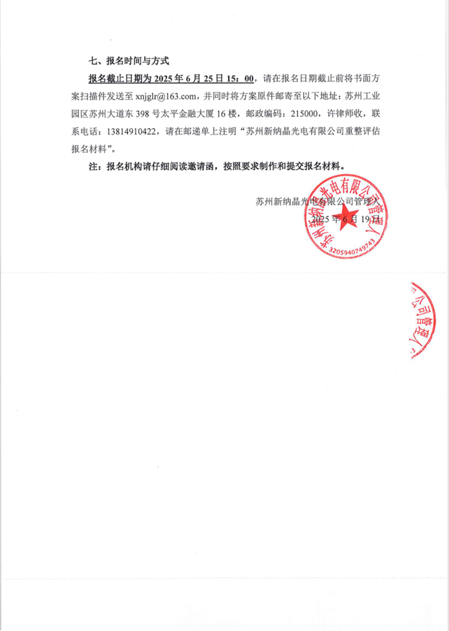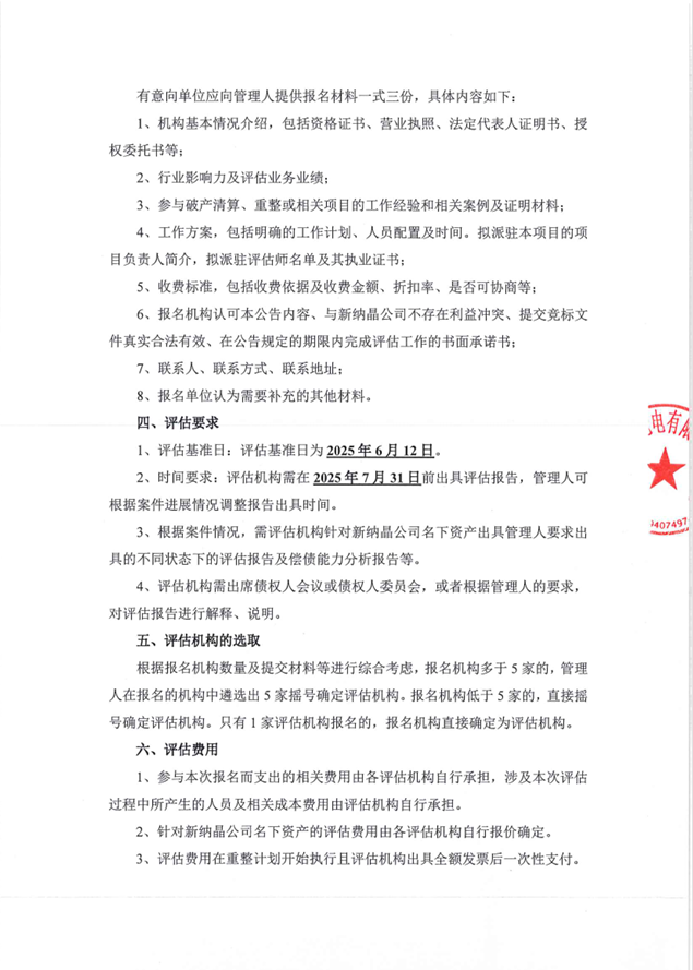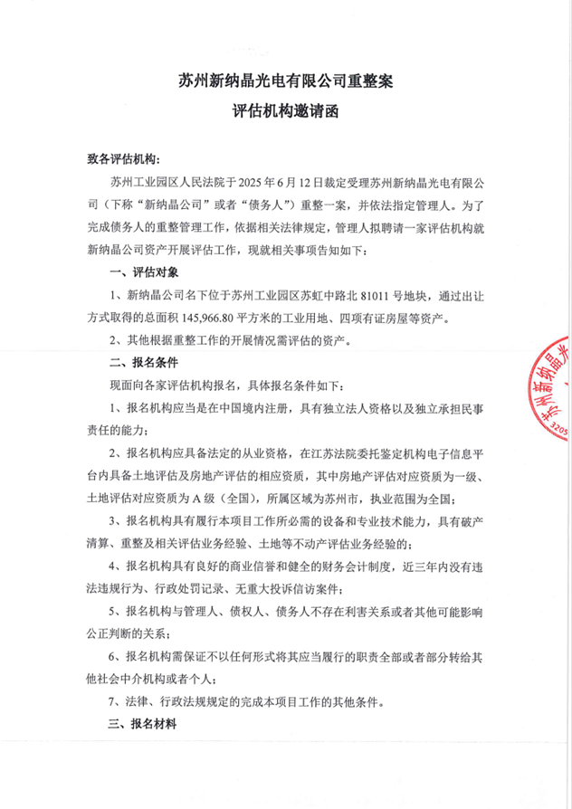 蘇州新納晶光電有限公司關(guān)于公開招募評估機(jī)構(gòu)的公告