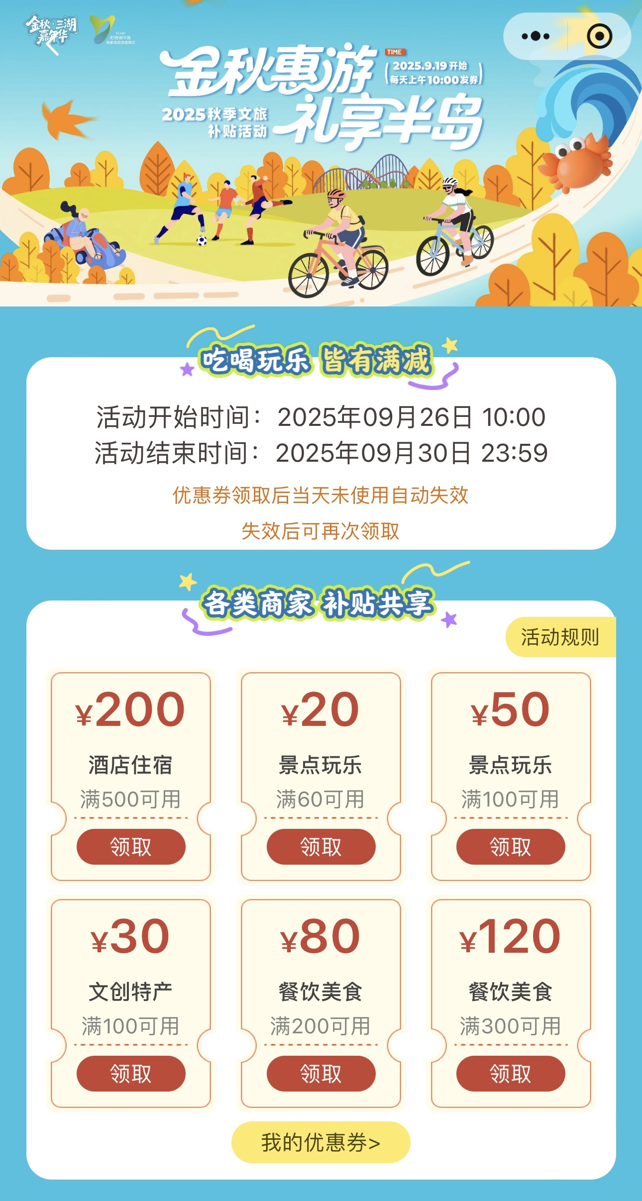 即日起至9月30日,每日10:00起,“惠游園區”小程序將限量發放文旅消費券,覆蓋餐飲、住宿、文創、娛樂等多個場景。市民游客只需注冊登錄小程序,進入文旅消費活動專題頁面,即有機會領取不同面額的優惠券,數量有限、先到先得。