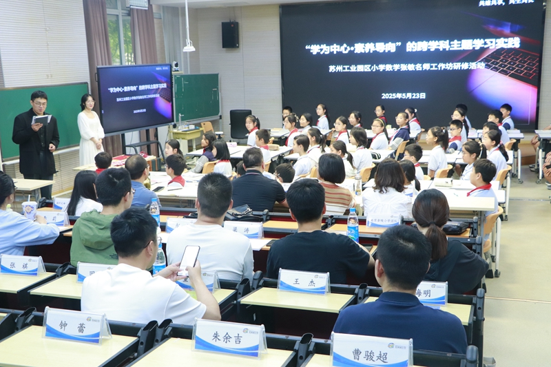 2025年5月23日下午,蘇州工業(yè)園區(qū)小學(xué)數(shù)學(xué)張敏名師工作坊第3次研修活動暨“蘇·寧·揚(yáng)”三校小學(xué)數(shù)學(xué)區(qū)域教學(xué)聯(lián)盟研修活動在青劍湖小學(xué)開展,活動以“學(xué)為中心·素養(yǎng)導(dǎo)向”的跨學(xué)科主題學(xué)習(xí)實(shí)踐為主題,張敏名師工作坊全體成員、南京市金陵小學(xué)數(shù)學(xué)團(tuán)隊(duì)、揚(yáng)州市文峰小學(xué)數(shù)學(xué)團(tuán)隊(duì)、青劍湖教育集團(tuán)各校骨干教師,青劍湖小學(xué)全體教師參加了活動。