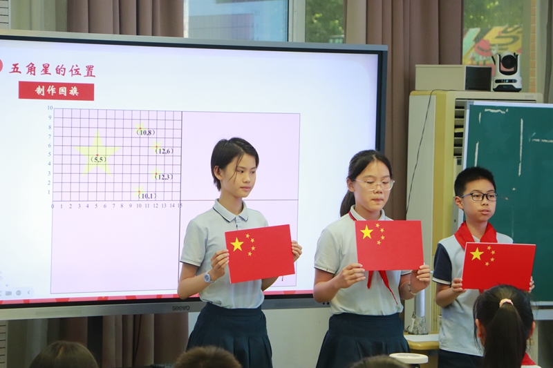 揚(yáng)州市文峰小學(xué)陳姝君老師執(zhí)教《數(shù)說“中國紅”》,將數(shù)學(xué)與美術(shù)學(xué)科相融合,以國旗設(shè)計為主任務(wù),引導(dǎo)學(xué)生在“認(rèn)識國旗-設(shè)計國旗-制作國旗”的實(shí)踐活動過程中,逐步培養(yǎng)學(xué)生的空間觀念、學(xué)科情感和家國情懷。